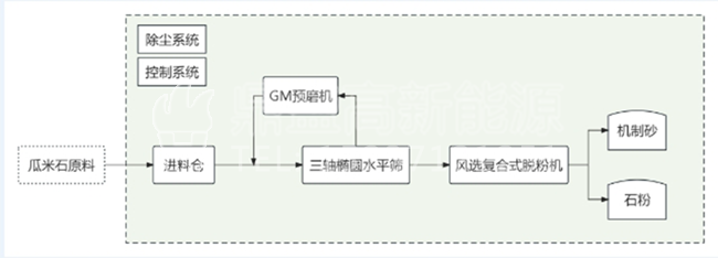 主用裝備:瓜米石低制粉全篩分制砂機、三軸圓水平篩、風(fēng)選復(fù)合式脫粉機、除塵系統(tǒng)、控制系統(tǒng)